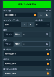 - 条件付き停止: 特定の条件を満たした場合に自動ベッティングを停止する機能です。例えば、ある程度の損失を被った時に自動でプレイを停止することができます。
